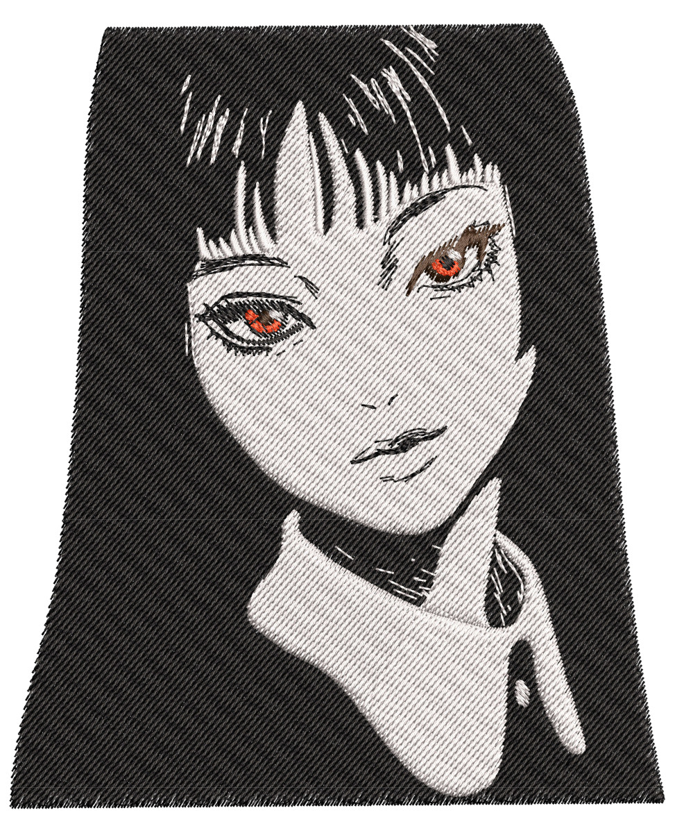 This custom anime machine embroidery design and pattern features the Junji character Tomie as she tilt.