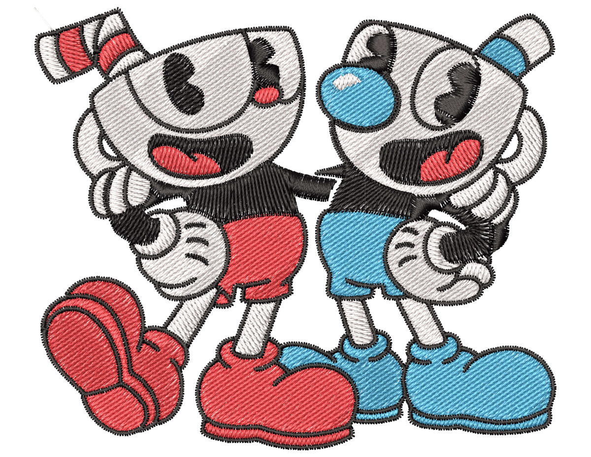 This custom machine embroidery design and pattern features the Cuphead videogame duo characters Mugman and Cuphead.