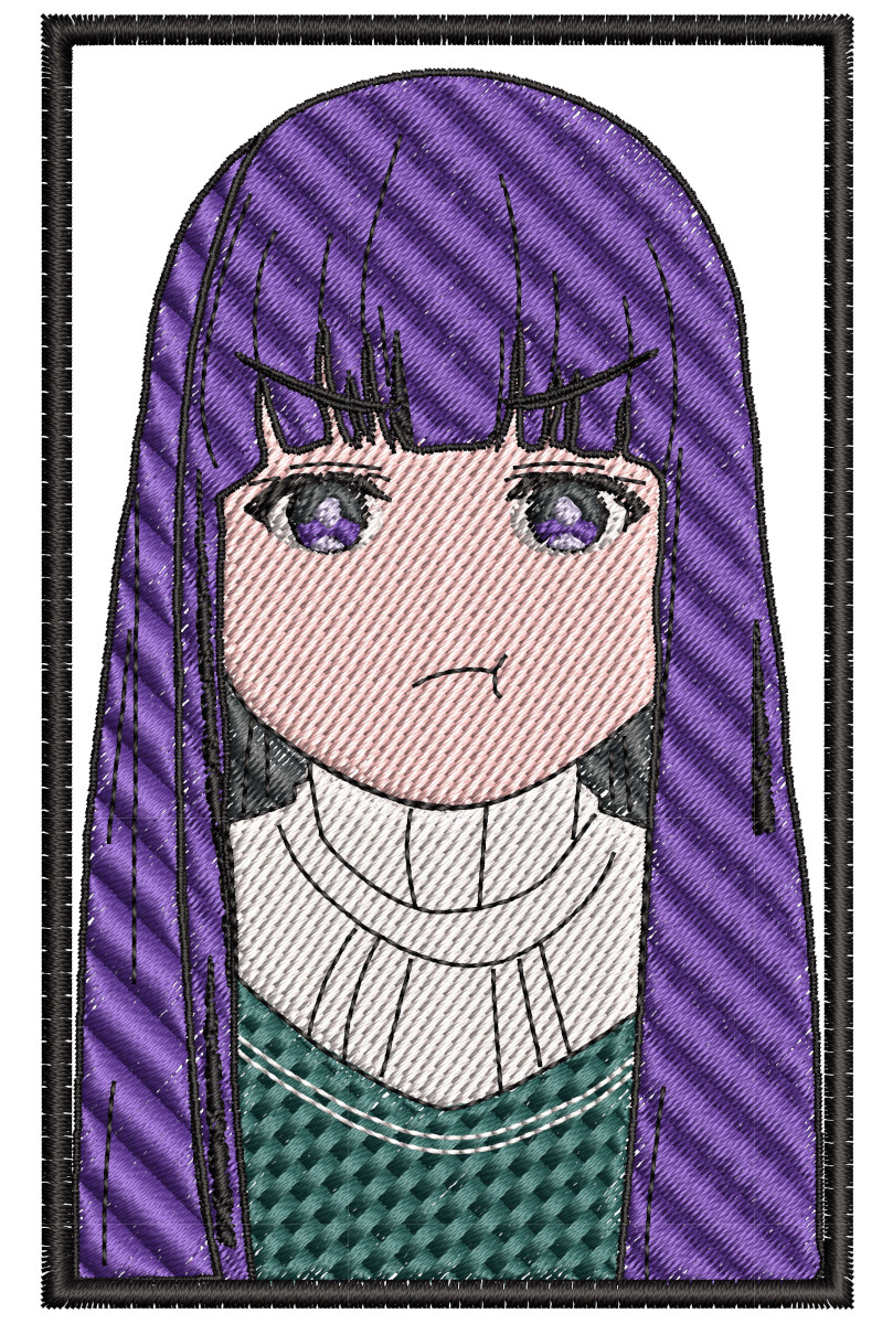 This custom anime machine embroidery design and pattern features the Frieren and Friends Fern character torso done in a framed.