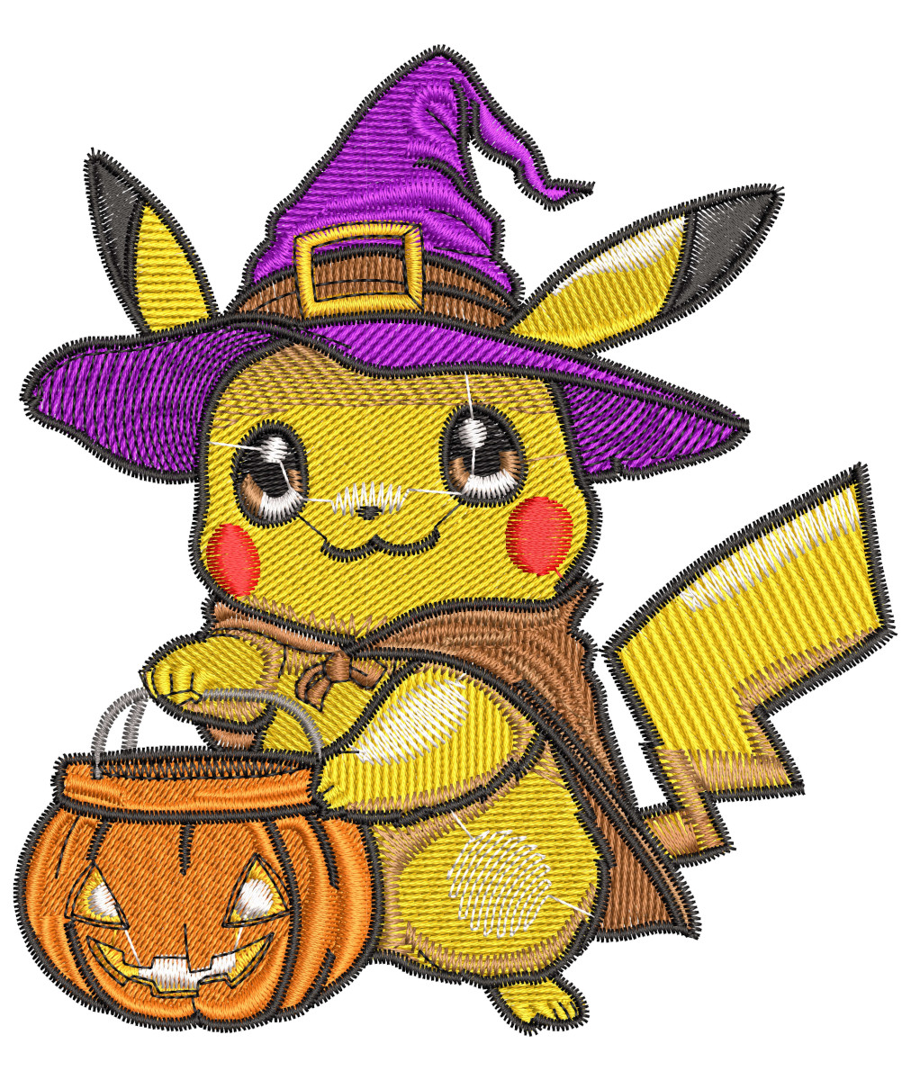 This custom machine embroidery design and pattern features the Pokemon character Pikachu as he is dressed for Halloween.