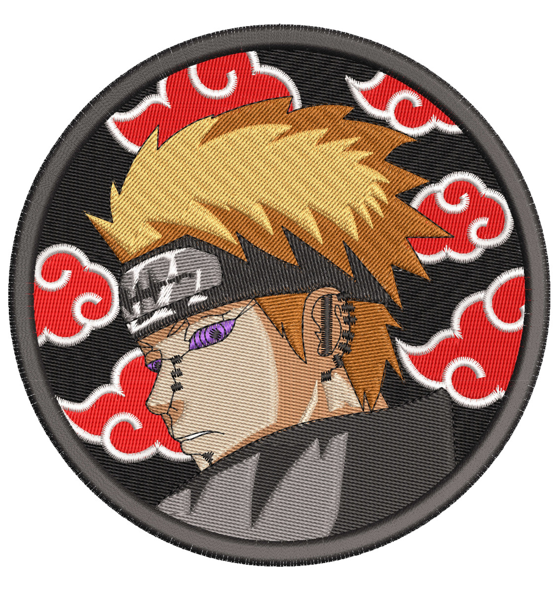 This custom anime machine embroidery design and pattern features the Naruto Shippuden character Yahiko Pain done in a round circle.