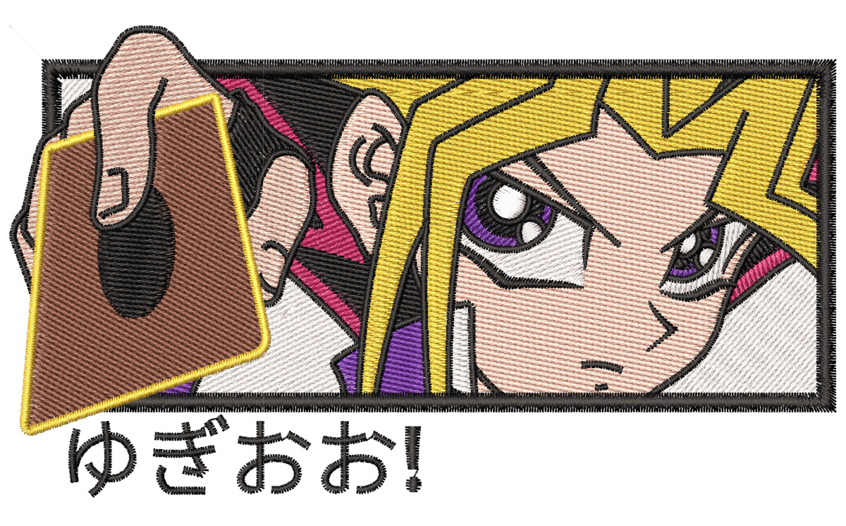 This custom anime machine embroidery design and pattern features Yugioh as he trades a card.